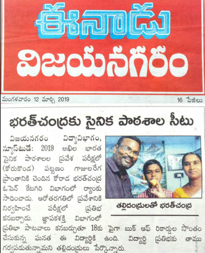 Military school seat for Bharatchandra Newsday: 2019 All India Korada Bharatchandra from Gajularega area of ​​town got rank in open category section in Vizianagaram education department, military school entrance examination (Korukonda). He excelled in the examination conducted for admission to the sixth standard. This student has the honor of scoring more than 18 while showing talent in the memory section. Parents said that they are proud. The book of records belongs to the student talent themselves
