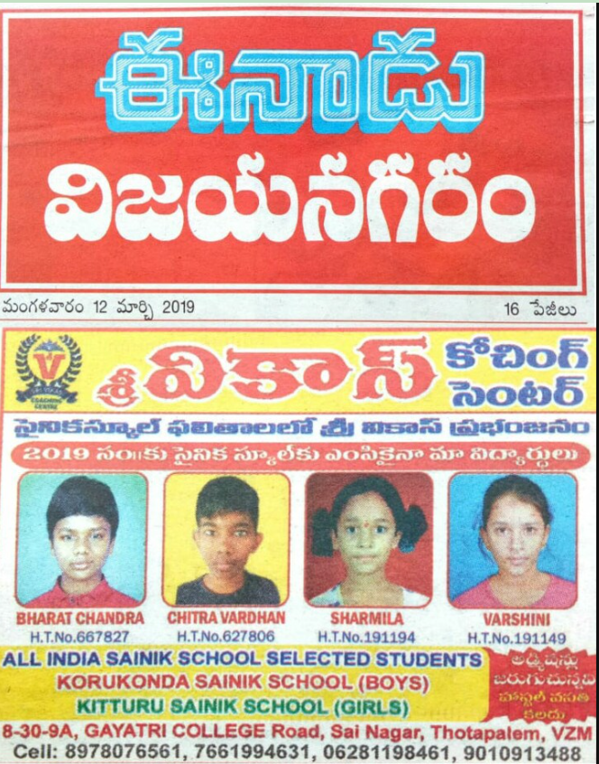 Sri Vikas Coaching Center takes immense pride in its students' outstanding success in the 2019 Sainik School entrance exams. Our dedicated coaching and expert guidance have helped Bharat Chandra, Chitra Vardhan, Sharmila, and Varshini secure admissions to the prestigious Korukonda Sainik School (Boys) and Kittur Sainik School (Girls). This achievement reflects our commitment to providing top-quality training, personalized mentoring, and strategic preparation for competitive exams. Our experienced faculty ensures that every student receives the necessary support to excel in their academic journey. Join Sri Vikas Coaching Center and take the first step towards a bright and successful future!